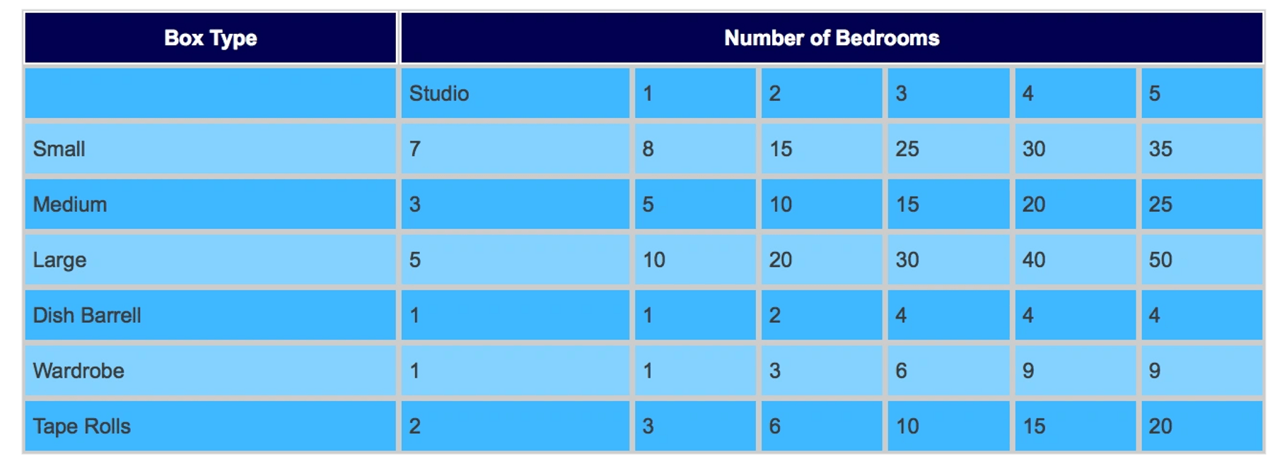 All sizes and amounts are estimates as your needs are unique. Unused boxes and supplies may be returned for a refund with your reciept.